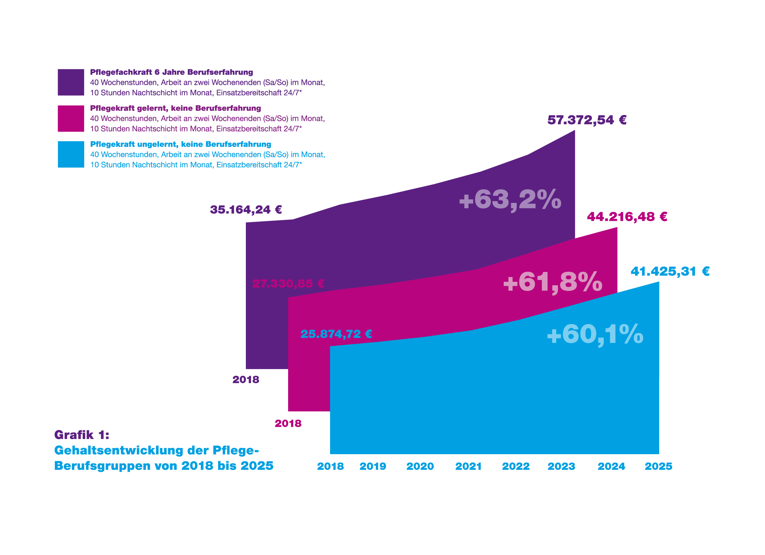 Die Entwicklung der Gehälter in der Diakonie zeigt die nebenstehende bzw. nachfolgende Grafik für drei Pflegeberufe, die mit den Kriterien zur Berufserfahrung, Arbeitszeit und Einsatzbereitschaft repräsentativ für unsere Beschäftigten stehen. Um 60 Prozent stieg demnach in den vergangenen sieben Jahren das Jahreseinkommen für eine ungelernte Pflegekraft (EG 3) – um 62 Prozent für eine gelernte Pflegekraft (EG 4) – um 63 % für eine Pflegefachkraft.