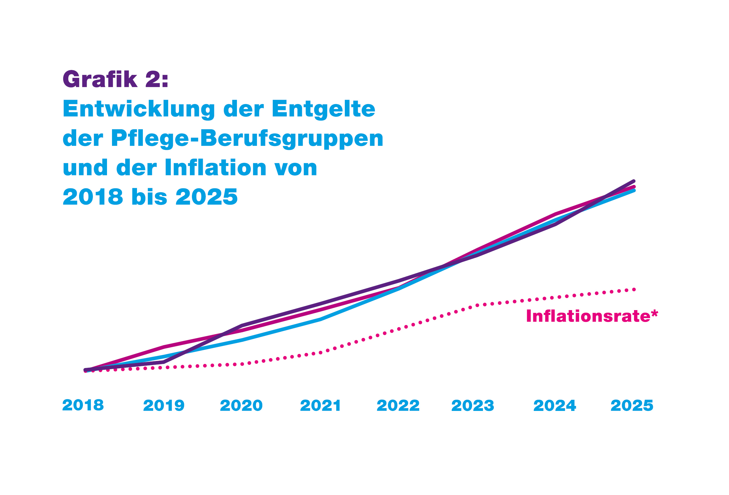 Die zweite Grafik zeigt: Die Gehaltsentwicklungen sind deutlich höher als die Inflation. Während die Gehälter für Pflegehelfer, Pflegekräfte und Pflegefachkräfte von 2018 bis 2025 um rund 7 Prozent pro Jahr bzw. rund 60 Prozent insgesamt stiegen, erhöhte sich die Inflationsrate in Deutschland um rund 3,2 Prozent pro Jahr bzw. insgesamt um 23,9 Prozent. Die Rate besagt, wie sich die Preise für private Ausgaben in Deutschland im Durchschnitt verändern. Heißt am Ende: Unsere Pflege-Mitarbeitenden haben mehr Geld in der Tasche – und können sich mehr leisten.